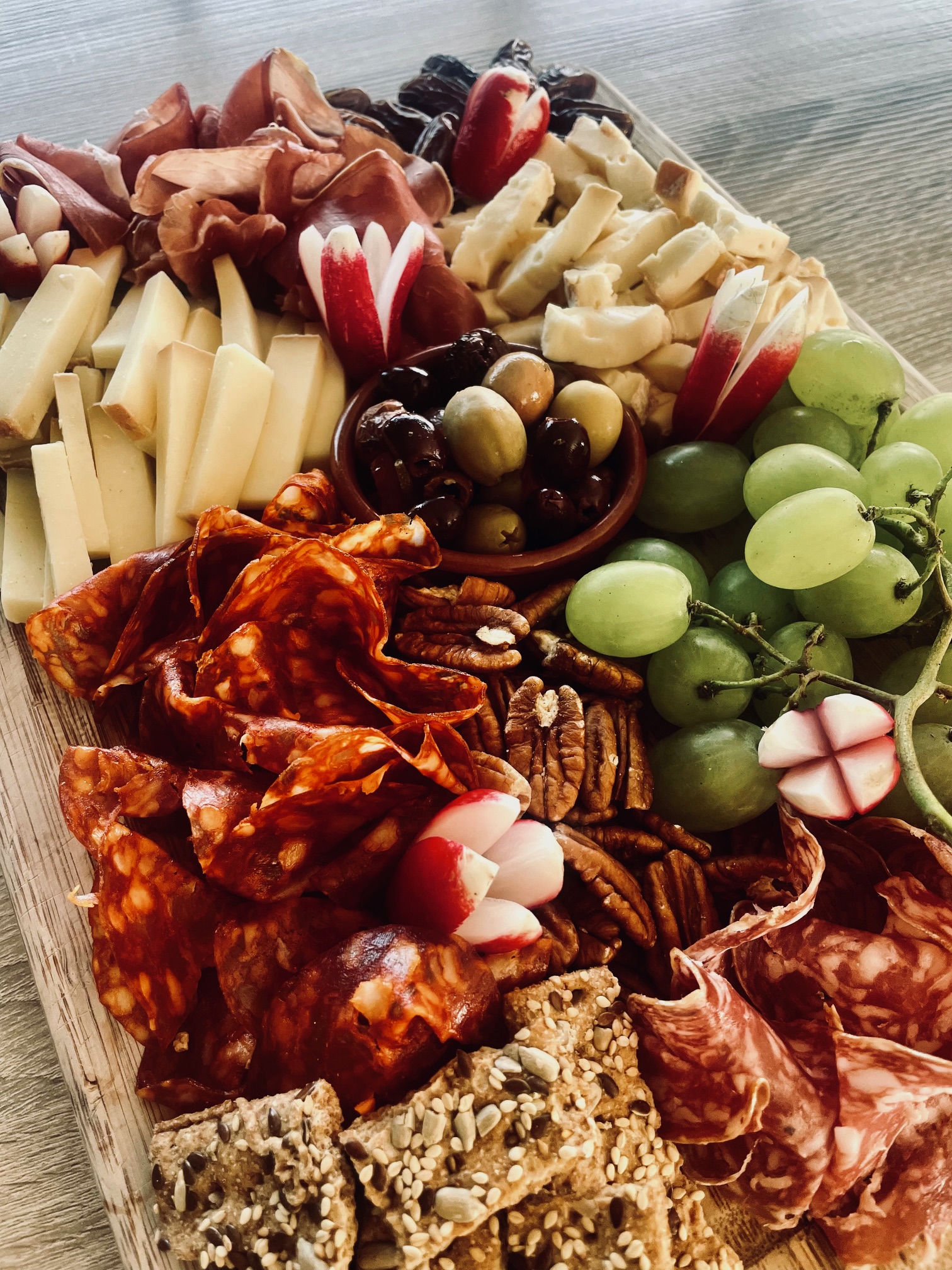 Saucisson, chorizo, terrine de lapin au Muscadet, coppa, lomo séché, Rocamadour, St Nectaire, fruits secs, tomates cerises, radis, olives marinées, cornichons